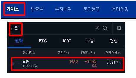 1.상단의 거래소 탭을 클릭후 원화 마켓이니까 한글로 트론을 검색하고 트론 거래 페이이지로 이동합니다.